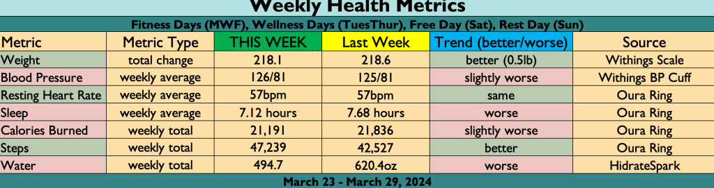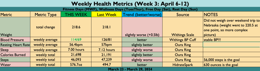 Blood pressure continues to improve (I’ve switched from twice a day to once a day in the evening for a consistent measurement when my BP meds are at full impact). Water also improved based on some serious effort and smart bottle reminders. Weight was all over the place to due a short weekend trip where my food habits were disrupted, but I’m back on track now and the numbers are already dropping. So hopefully better news there at the end of Week 4!