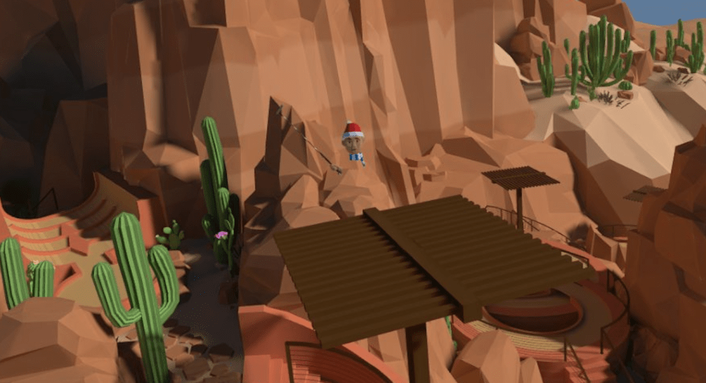 I got to do Community Time today with my whole team, and I proposed a “team building exercise”. We went into Walkabout Minigolf and set our Locomotion to 2.0 (some of the team are getting used to flying in VR). Then we lined up out in the water around Welcome Island and took off like a little train, following the lead of the person in front. I’ve read that when you do things in unison (flash mobs come to mind) it causes a bonding element. I was at the back of the train as we approached the large pirate ship. I shouted “let’s jump it!” The person in the lead rose out of the water and appeared to be jumping just the “boat” portion. I shouted “all the way over the highest mast!!!” and responding to the leader, all of us shifted into an almost vertical climb high into the sky. As we crossed the top mast, I shouted “back to the water!!” and we descended again in a straight line down to the water below. It was thrilling. We were in that moment TOGETHER. I can remember it right now almost 12 hours later, as if it’s still happening. And that is powerful. That is team building on a whole new level, and I was thrilled with how it went. Hopefully as our tolerance for “flying in VR” increases, so will our speeds (it goes up to 5.0).